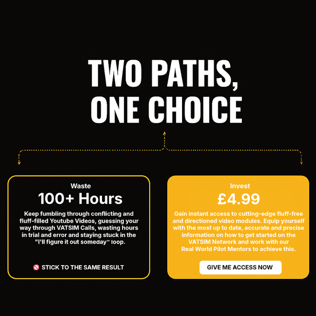 Don’t keep struggling through scattered tutorials and trial-and-error flights. With VATSIM Mastery, you’ll get the structure, support, and expert guidance to fly with confidence. Whether you’re brand new, overwhelmed, or aiming for full realism, your journey starts here.